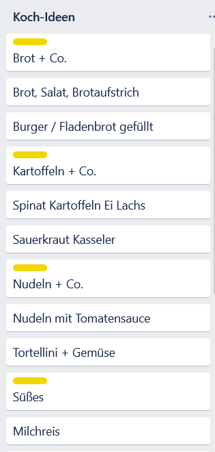 - Anlegen der Liste „Koch-Ideen“ mit gewünschten Kategorien (z.B. Brot & Co; Nudeln & Co, Kartoffeln & Co, Süßes, Wochenende, Gemüse)